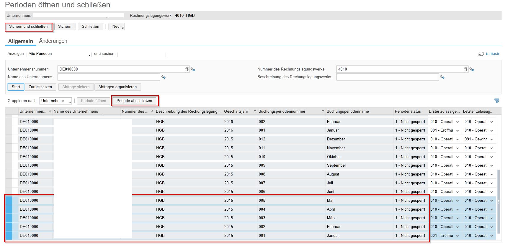 Wenn Buchungsbelege für eine oder mehrere Perioden gesperrt werden sollen, können diese abgeschlossen werden. Folgend werden beispielsweise die Monate Januar bis Mai des Geschäftsjahres 2015 abgeschlossen.
